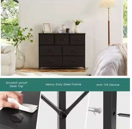 [Multifunctional Bedroom Dresser]This dressers for bedroom with drawers will save you space. Place this clothing storage in the closet to offer a home for workout gear and blankets; Place it in the nursery as a kids dresser or baby dresser to store baby clothes and stuff; place it in the entryway as a storage saving unit for frequently used items, and is a great piece of furniture for your bedroom, living room, hallway, entryway, closet, nursery, playrooms.[Large Storage Space]With 4 large drawers and 3 small drawers, this dresser offers generous storage capacity. You can organize your belongings neatly by dividing the compartments. The bottom large drawer can accommodate at least 12 adult T-shirts or 7 pairs of jeans, while the 3 small drawers are ideal for socks, underwear, toddler toys, etc. If you have multiple dressers, they can be stacked to save space.[Drawer Dresser with Sturdy Frame & Feet]This dresser set for bedroom is built with a sturdy metal frame to ensure stability. It is equipped with 4 adjustable feet to safeguard your floor from scratches, and you can effortlessly balance the dresser in tight spaces. Moreover, it comes with an anti-tilt device that can be utilized when mounting the bedroom dresser sets to the wall, preventing accidents caused by uneven floors or children climbing.[High- quality Material]This fabric dressers for bedroom is made of cationic materials, all other sides and gaps are made of high-quality breathable, and non-woven synthetic fiber, harmless and wear-resistant, suitable for kids, teens, and adults. Easy-pull drawers for smooth sliding and closing. The bedroom dressers for easy cleaning, just wipe with a damp cloth and get it air-dried.[Easy to Assemble Big Dresser for Bedroom] The packages will come with all the tools and accessories for quick assembly, which allows only about 20 minutes to assemble your storage drawers with detailed instructions and the installation video. Overall dimensions: 39.37" L x 11.81" W x30.32" H. If you have encountered any problems